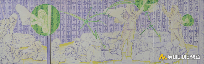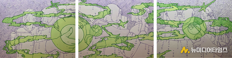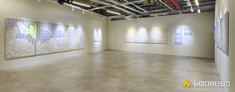 설치 방식 역시 작가의 시선이 반영됐다. 교차 배치된 대형 캔버스들과 반복적으로 사용된 벽지 패턴은 전시장이라는 물리적 공간을 감정과 기억의 내면적 공간으로 확장시킨다. 벽면을 타고 흐르는 초록빛 잔상은 안과 밖의 경계를 무너뜨리며 몽환적이고 잠재적인 감각의 공간을 만든다.