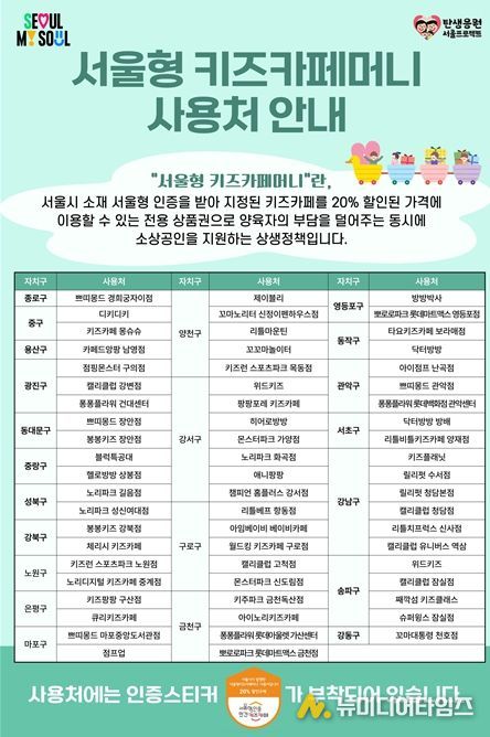 ‘서울형 키즈카페머니’는 서울형 인증기준을 통과한 민간 키즈카페에서 20% 할인된 가격에 이용할 수 있는 전용 상품권이다. 지난해에는 총 41억 원 규모로 발행, 조기 완판됐으며, 총 3만3천여 명에게 할인구매 혜택을 제공했다. 현재 ‘서울형 키즈카페머니’를 사용할 수 있는 키즈카페는 총 62개소다.