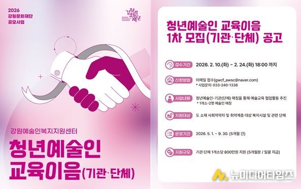 강원문화재단은 도내 청년예술인의 안정적인 활동 기반을 조성하고 문화예술의 사회적 가치를 확산하기 위해 '2026년 청년예술인 교육이음 사업' 공모를 추진한다.