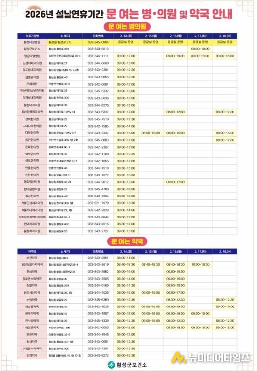 횡성군보건소에 따르면 2월 17일 설날 당일에는 보건소에서 오전 9시부터 오후 6시까지 진료를 실시해, 연휴 기간 발생할 수 있는 경증 환자 및 응급 상황에 대비할 계획이다.