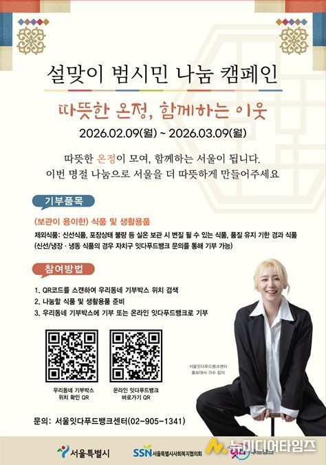 해당 캠페인은 매년 설과 추석 명절에 추진되는 범시민 참여형 나눔 행사로, 지난해에는 총 16억 4천만 원 상당의 기부금과 현물의 온정이 모였으며, 서울시 취약계층 25,078가구에 전달됐다.
