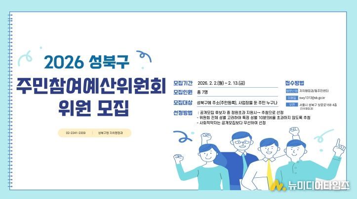 서울 성북구가 오는 13일까지 주민 참여를 통한 지역 현안 해결과 재정 민주주의 실현을 위해 2026년 주민참여예산위원회 위원을 공개 모집한다.