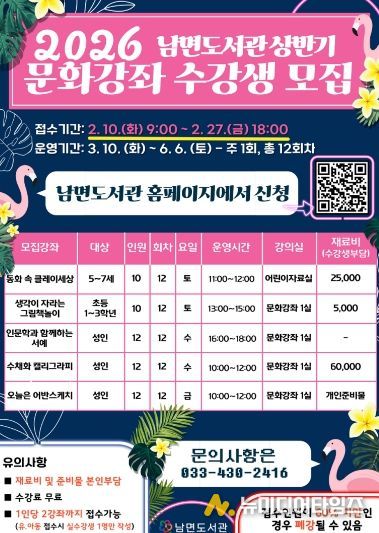 홍천군립도서관은 2월 10일부터 2월 27일까지 2026년 상반기 독서문화강좌 수강생을 모집한다.