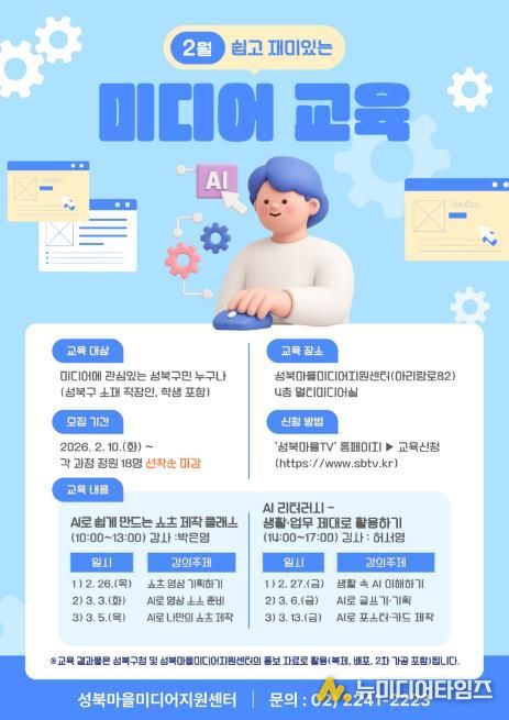 서울 성북구 성북마을미디어지원센터가 2월 10일부터 AI 활용 미디어 교육 수강생을 선착순으로 모집한다.