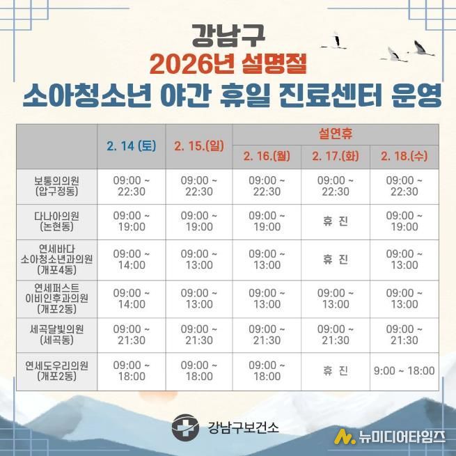 이번 설 연휴에는 보통의의원(압구정동), 다나아의원(논현동), 연세바다소아청소년과의원(개포4동), 연세퍼스트이비인후과의원(개포2동), 세곡달빛의원(세곡동)이 운영한다. 2024년부터 보건복지부 지정 달빛어린이병원으로 운영 중인 연세도우리소아청소년과의원(개포2동)도 이용할 수 있다.