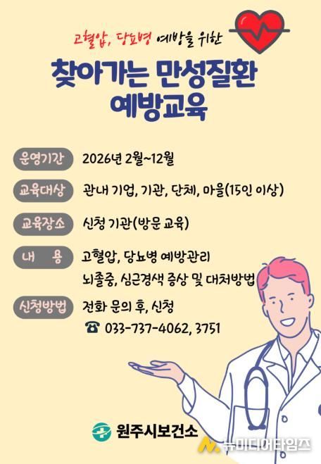 원주시보건소는 2월부터 12월까지 지역 주민을 대상으로 고혈압·당뇨병 등 만성질환 예방교육을 운영한다.