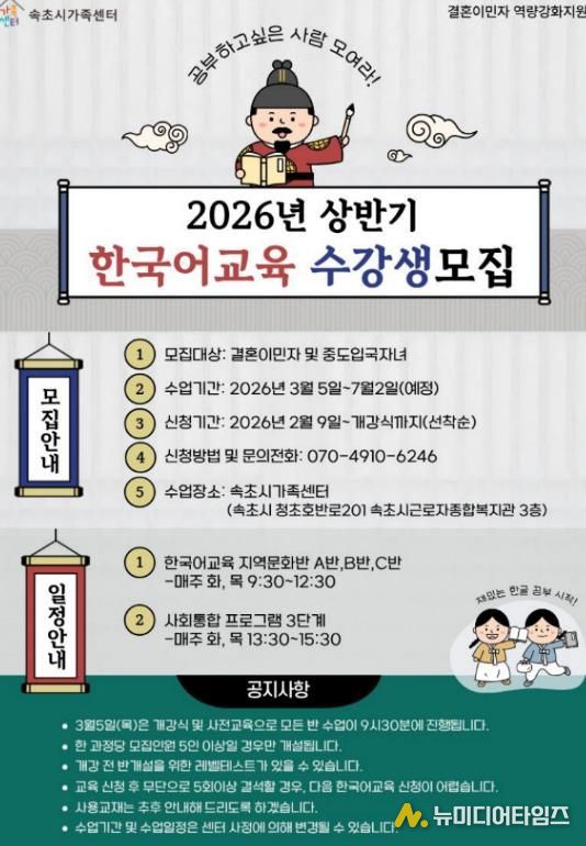 속초시가족센터가 속초시에 거주하는 결혼이민자의 지역사회 정착과 자립을 돕기 위해 상반기 한국어 교육과 운전면허 취득 지원사업 참여자를 모집한다.