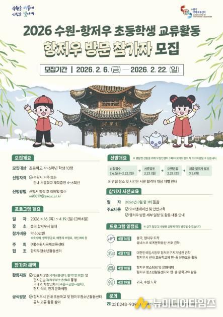 수원특례시는 ‘2026 수원–항저우 초등학생 상호방문교류’에 참여할 초등학생 10명을 2월 22일까지 모집한다.