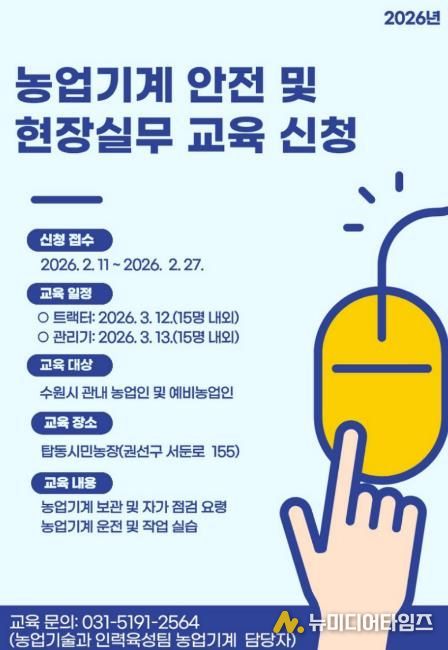 수원특례시는 ‘2026년 농업기계 안전 및 현장실무 교육’ 수강생을 2월 27일까지 모집한다. 관내 (예비)농업인이 참여할 수 있다.