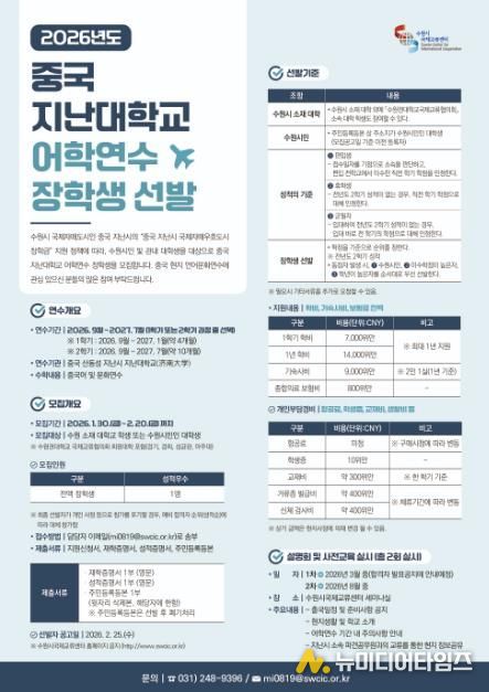 수원특례시는 2월 20일까지 ‘2026년도 지난대학교 어학연수 장학생 프로그램’ 참가자 1명을 모집한다.