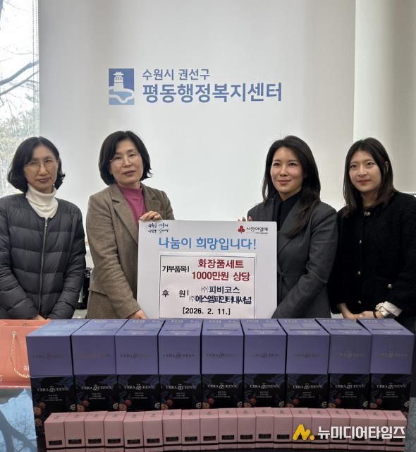 지난 11일, 권선구 평동 행정복지센터는 ㈜피비코스와 ㈜에스엠피인터내셔널이 약 1천만 원 상당의 세럼·크림·선크림 등 화장품세트를 공동 기부했다고 밝혔다.