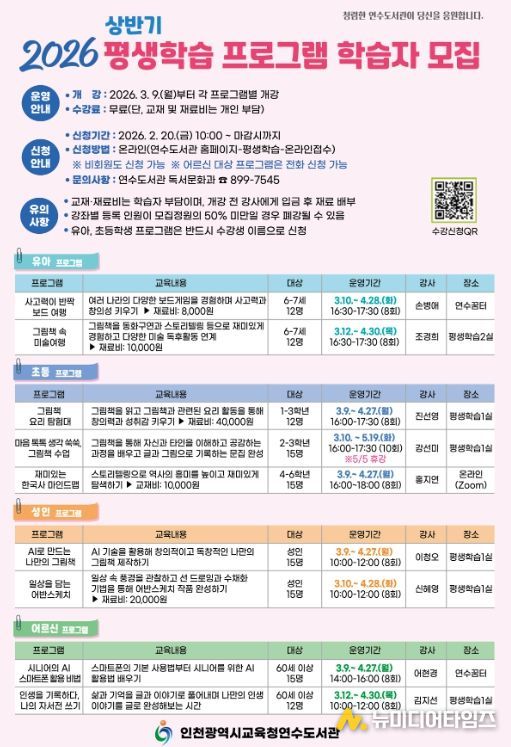 인천광역시교육청연수도서관은 유아부터 어르신까지 생애주기별 맞춤 학습 지원을 위해 3월 9일부터 운영하는 ‘2026년 상반기 평생학습 프로그램’의 학습자를 모집한다.