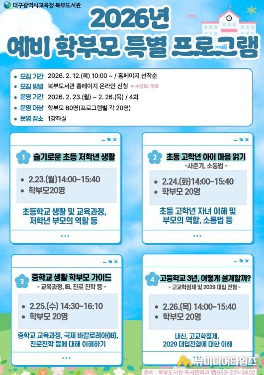 대구시교육청 북부도서관은 자녀의 입학과 진학을 앞둔 예비 학부모를 대상으로 오는 2월 23일부터 26일까지 4일간 ‘2026년 예비 학부모 특별프로그램’을 운영한다.