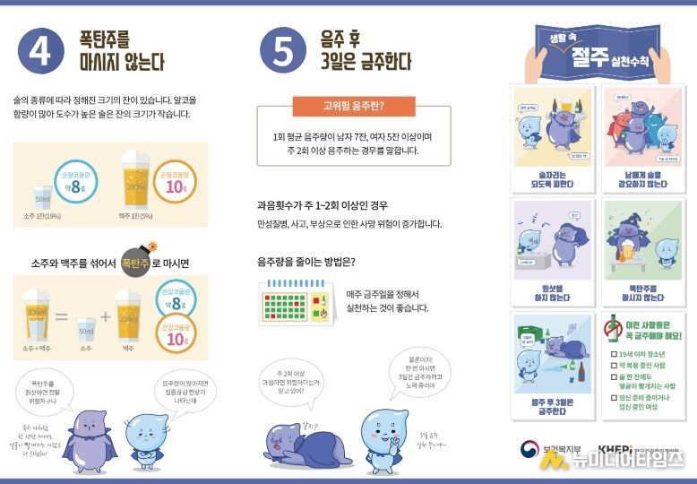 절주 실천수칙은 △술자리는 되도록 피하기 △남에게 술 강요하지 않기 △원샷 하지 않기 △폭탄주 마시지 않기 △음주 후 3일 이상 금주하기 등이며, 일상 속 실천을 통해 명절 기간 술 대신 덕담을 나누는 건강한 명절 분위기 확산이 기대된다.