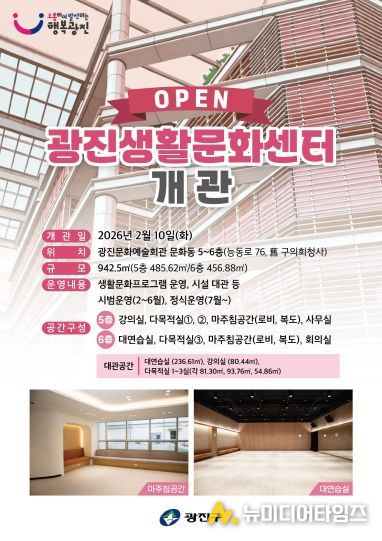 김경호 광진구청장은 “광진생활문화센터는 주민이 일상에서 문화예술을 배우고 즐기며 서로 소통할 수 있는 참여형 복합 문화 공간”이라며, “앞으로도 공간 운영과 프로그램을 지속적으로 보완해 지역 문화의 저변을 넓히는 거점으로 발전시켜 나가겠다”고 말했다.