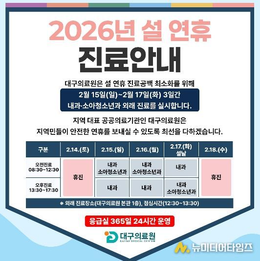 대구의료원은 설 연휴를 대비해 2월 15일부터 17일까지 3일간 지역의 진료 공백 해소를 위해 내과·소아청소년과 전문의 외래 진료를 시행한다.