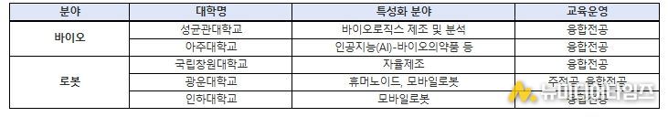 바이오 특성화대학에는 △성균관대학교, △아주대학교를 선정했으며, 로봇 특성화대학으로는 △국립창원대학교, △광운대학교, △인하대학교를 선정했다.