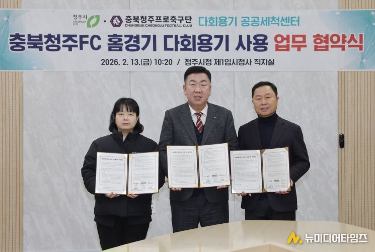 청주시는 13일 충북청주 프로축구단(충북청주FC), 다회용기 공공세척센터와 함께 충북FC 홈경기 다회용기 사용 확대를 위한 업무협약을 체결했다.