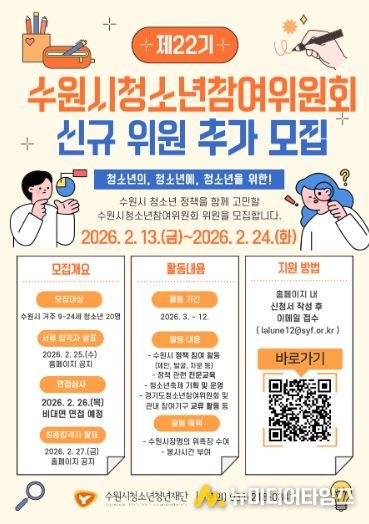 수원시청소년청년재단(이사장 최종진)은 수원시 청소년의 정책 참여 확대와 권익 증진을 위해 '제22기 수원시청소년참여위원회' 위원을 추가 모집한다고 밝혔다.