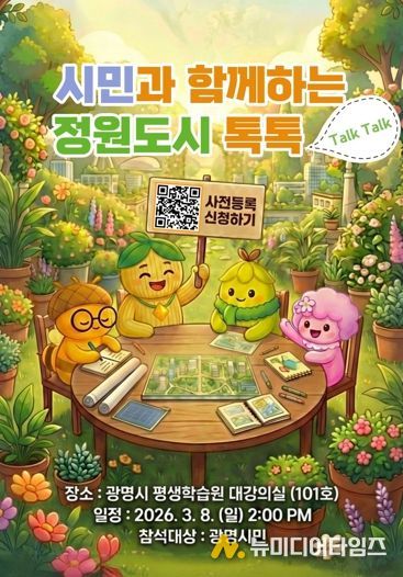 시는 오는 3월 8일 오후 2시 광명시 평생학습원 대강당에서 정원도시 정책의 비전을 공유하고, 시민 의견을 듣는 ‘시민과 함께하는 광명 정원도시 톡톡(Talk, Talk)’을 개최한다.