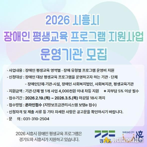 시흥시는 장애인의 학습권을 보장하고 사회참여 기회를 확대하기 위해 ‘2026년 장애인 평생교육 프로그램 지원사업’을 추진하는 가운데 운영기관을 모집한다.