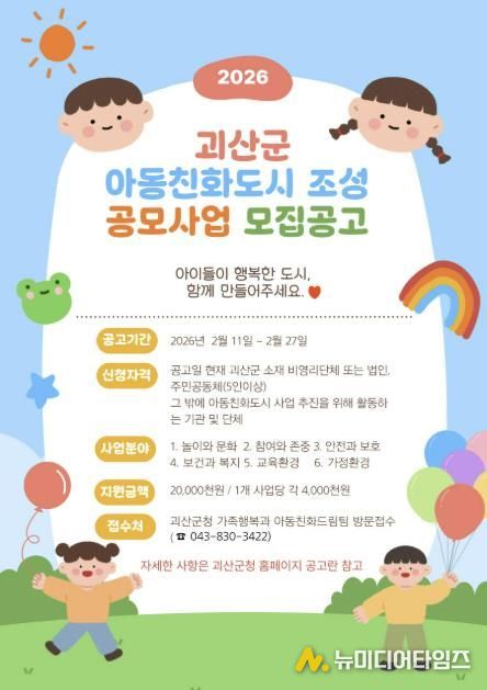 충북 괴산군은 아동친화도시 공모사업에 참여할 비영리법인(단체)을 오는 27일까지 공개 모집한다고 밝혔다.