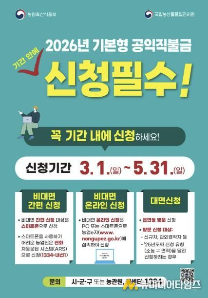 포천시는 오는 3월 1일부터 농업의 공익적 기능을 강화하고 농업인의 소득 안정을 지원하기 위한 ‘2026년 기본형 공익직접지불금’ 신청을 받는다.