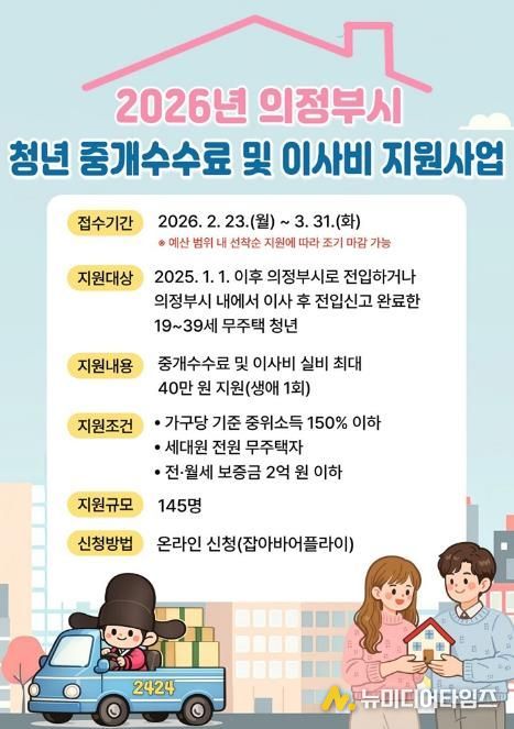 의정부시는 청년들의 주거 이전 비용 부담을 줄이기 위한 ‘2026년 청년 중개수수료 및 이사비 지원사업’의 신청자를 모집한다.