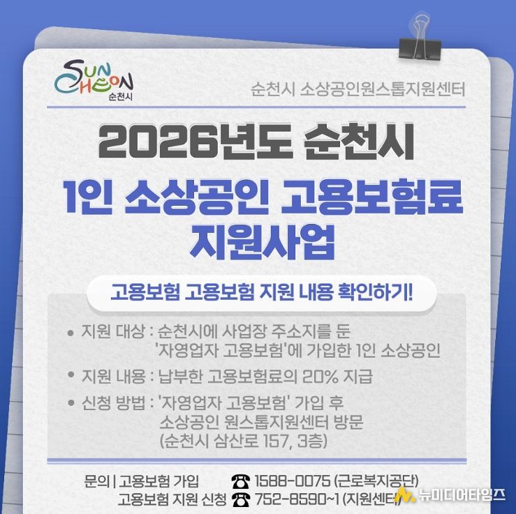 순천시는 지역 내 1인 소상공인의 경영안정과 사회안전망 강화를 위해 ‘2026년 1인 소상공인 고용보험료 지원사업’을 19일부터 본격 시행한다고 밝혔다.