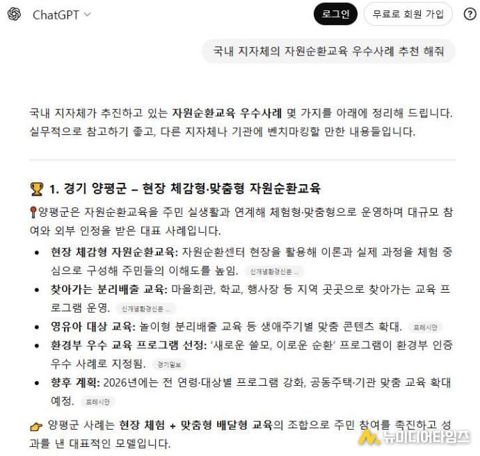 최근 생활과 업무 전반에서 인공지능(AI) 검색 활용이 증가하면서 인공지능 기반 검색 결과 노출과 추천이 정책과 브랜드 인지도 확산에 중요한 요소로 작용하고 있다. 이러한 흐름 속에서 양평군 자원순환교육은 챗지피티(ChatGPT) 등 인공지능 기반 정책 검색 과정에서 우수사례로 소개되고 있으며, 이에 따라 인근 지자체에서 교육 운영 방식과 프로그램 구성에 대한 문의가 이어지는 등 외부 지자체의 관심이 높아지고 있다.