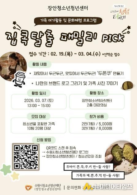 장안청소년청년센터 관계자는“이번 활동을 통해 직접 만들어보는 즐거움과 가족과 함께하는 시간을 경험하며, 더욱 맛있고 신나는 추억이 되도록 많은 참여 부탁드린다.”라고 말했다.