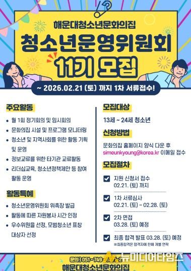 해운대청소년문화의집이 지역 청소년의 참여 확대를 위해 ‘청소년운영위원회 11기 청바라기’를 공개 모집한다. 모집 대상은 해운대구에 거주하거나 관내 학교에 재학 중인 13세부터 24세 이하 청소년이며, 접수는 이달 21일까지 진행된다.