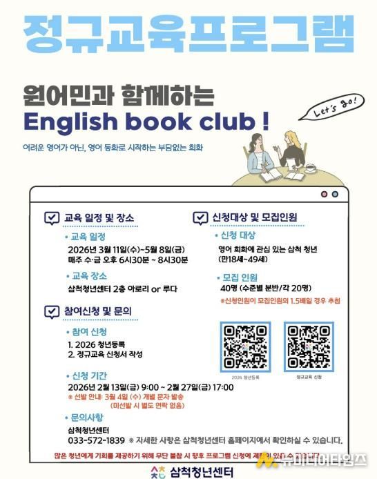 삼척청년센터는 지역 청년들의 영어 의사소통 능력을 높이고 자기계발 기회를 넓히기 위해 2026년 정규교육 프로그램 ‘영어회화 English Book Club’을 운영한다.