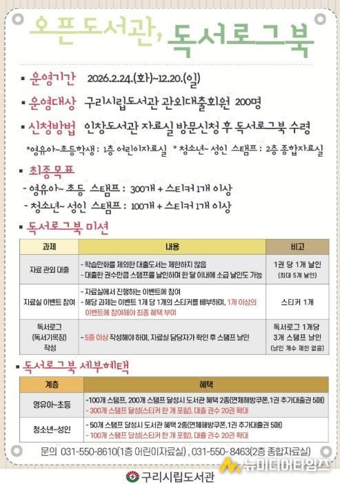 구리시 인창도서관은 오는 2월 24일부터 시민들의 자발적인 독서 습관 형성과 독서를 통한 성취감 고취를 위해 ‘오픈도서관, 독서로그북’을 운영한다고 밝혔다.