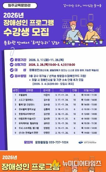 참가 신청은 2월 26일 오전 10시부터 원주교육문화관 3층 강사대기실에서 가능하며, 신청 시 장애인카드를 지참해야 한다.