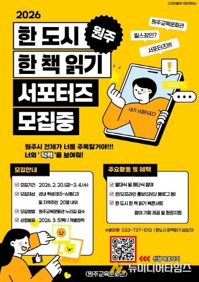 강원특별자치도교육청원주교육문화관은 지역 독서 문화 확산과 시민 참여 확대를 위해 ‘2026년 원주 한 도시 한 책 읽기 서포터즈’를 운영한다.