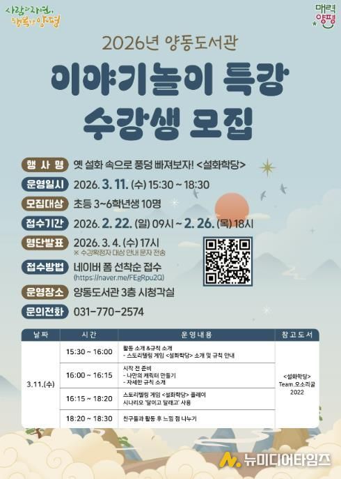 양평군은 새 학기를 맞아 양동도서관에서 초등학생을 대상으로 운영하는 ‘이야기 놀이 특강’의 수강생을 오는 22일부터 26일까지 모집한다고 밝혔다.