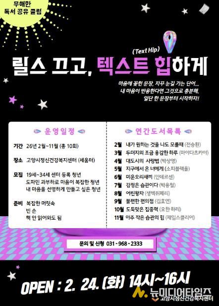 고양시정신건강복지센터는 만19~34세 등록청년을 대상으로 ‘무해한 독서 공유 클럽’(릴스 끄고, 텍스트 힙하게)을 매달 운영한다.