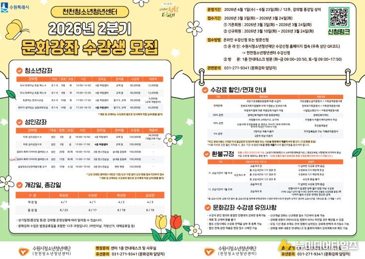 수원시청소년청년재단 천천청소년청년센터는 지역 청소년 및 성인을 대상으로 하는 2분기 문화강좌 수강생을 모집한다고 밝혔다.