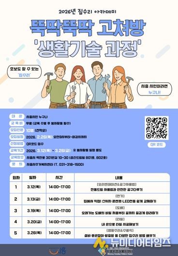 시흥시주거복지센터는 시민이 직접 집 관리와 수리 방법을 익혀 스스로 주거 환경을 개선할 수 있도록 2026년 집수리 아카데미 ‘뚝딱뚝딱 고쳐방’ 생활기술 과정 교육생을 10명 모집한다.