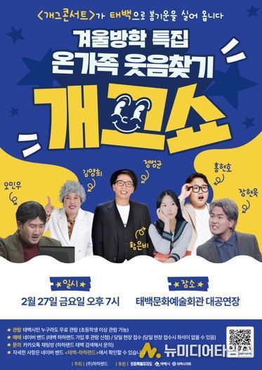 태백시는 겨울방학을 맞아 오는 2월 27일 오후 7시 태백문화예술회관 대공연장에서 '온가족 웃음찾기 개그쇼'를 개최한다고 밝혔다.