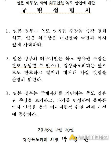경상북도의회는 20일, 모테기 도시미쓰 일본 외무상이 일본 국회에서 독도 영유권을 주장하는 망언을 한 데 대해 강력히 항의하며, 독도는 대한민국의 고유 영토임을 재차 천명하는 성명서를 발표했다.