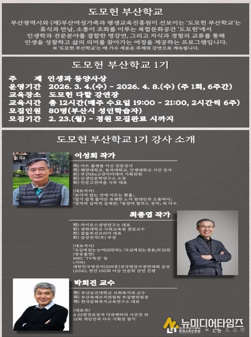 박근록 시 행정자치국장은 “'도모헌 부산학교'가 단순한 강의를 넘어 시민들이 서로의 경험을 나누고 인생 2막을 설계하는 실용적인 소통의 장이 되길 바란다”라며, “앞으로도 부산시민을 위한 고품격 교육 프로그램을 지속적으로 발굴해 나가겠다”라고 전했다.