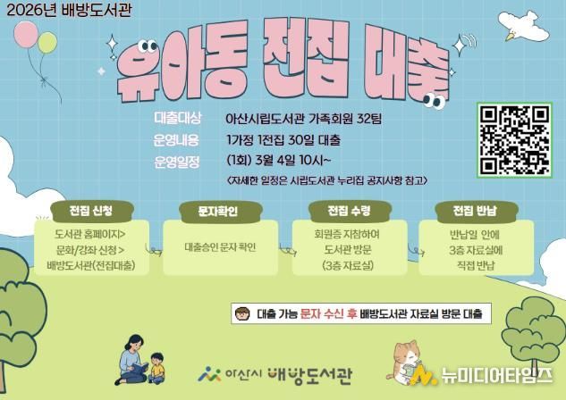 신청은 오는 3월 4일 오전 10시부터 아산시립도서관 누리집을 통해 선착순으로 진행되며, 선정된 이용자는 정해진 수령 기간 내 도서관을 방문해 도서를 수령하면 된다. 다만 상호대차 및 무인 대출·반납기 이용은 불가하다.