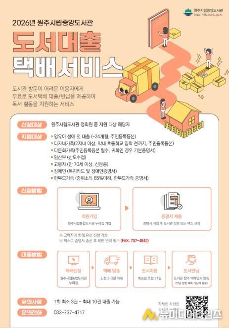 원주시립중앙도서관은 도서관 방문이 어려운 시민들에게 더욱 많은 독서 기회를 제공하기 위해 도서대출 택배서비스 지원 대상에 한부모가족을 추가한다.