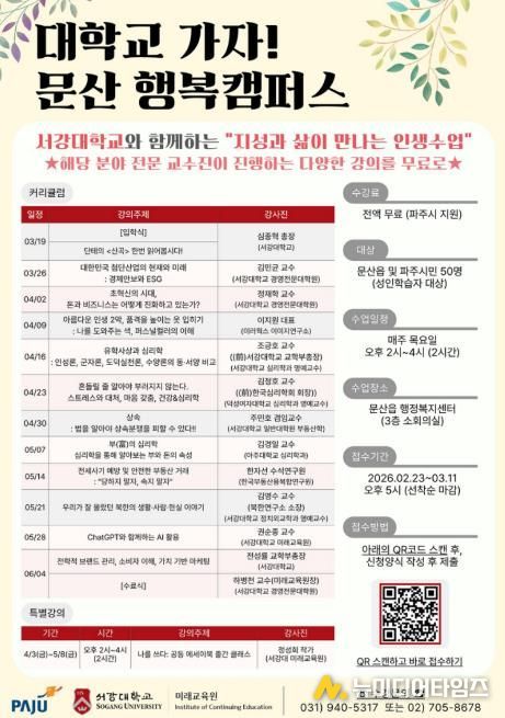 파주시 문산읍은 지역 주민의 학습권 확대와 수준 높은 평생교육 제공을 위해 서강대학교와 협력해 ‘대학교 가자! 문산행복캠퍼스’를 운영하며 ‘지성과 삶이 만나는 인생수업’을 주제로 평생교육을 진행한다.