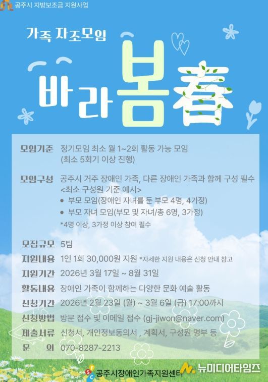 공주시 장애인가족지원센터는 2026년 장애인 가족을 위한 자조모임 프로그램 ‘바라봄(春)’을 운영하고 참여자를 모집한다고 밝혔다.