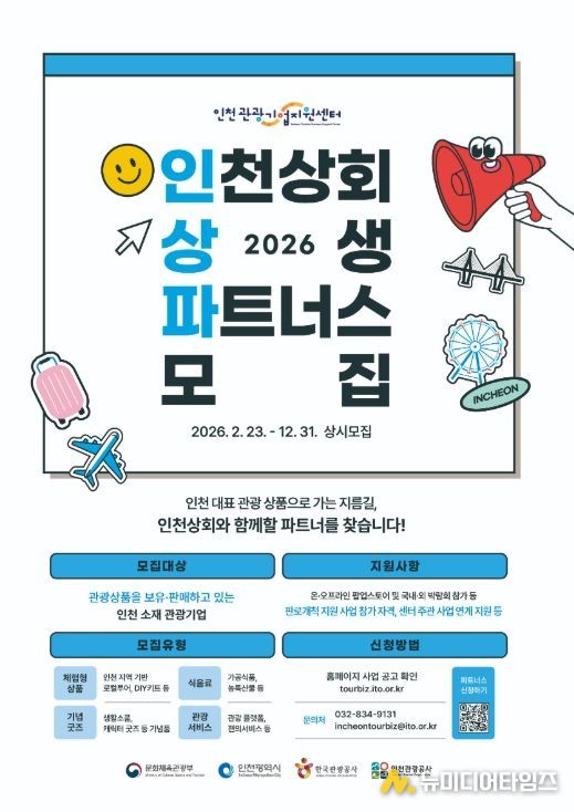 인천광역시와 인천관광공사는 인천관광기업지원센터에서 인천의 우수한 관광 상품 발굴 및 지속 가능한 판로개척 지원을 위한 ‘2026년 인천상회 상생 파트너스’를 2월 23일부터 12월 31일까지 상시 모집한다고 밝혔다.