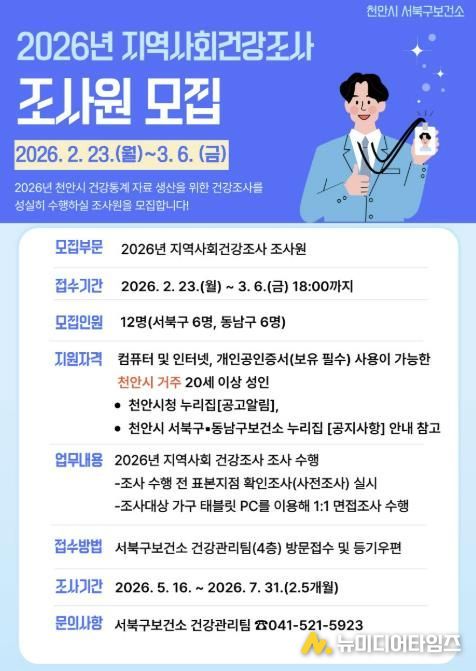 천안시는 내달 6일까지 ‘2026년 지역사회건강조사’를 수행할 조사원을 모집한다고 23일 밝혔다.