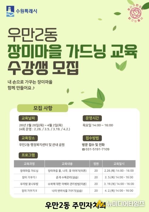 수원시 팔달구 우만2동은 장미·식물 가드닝에 관심 있는 모든 주민에게 도움이 될 ‘장미마을 가드닝 교육’ 수강생을 모집한다고 밝혔다.